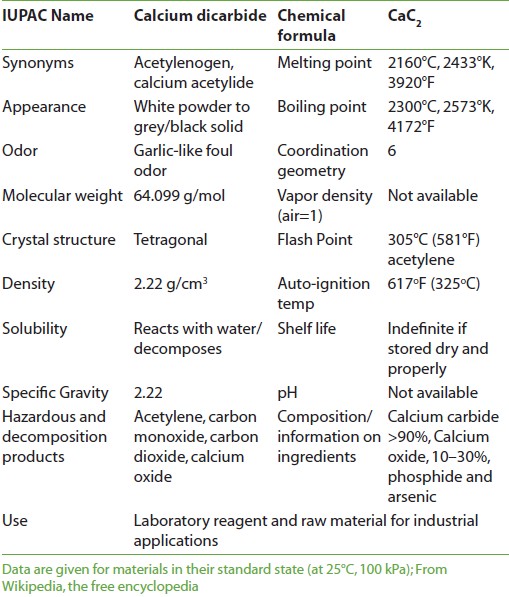 Asif M. Physico-chemical properties and toxic effect of fruit-ripening agent calcium carbide. Ann Trop Med Public Health [serial online] 2012 [cited 2020 Feb 25];5:150-6. Available from: https://www.atmph.org/text.asp?2012/5/3/150/98602