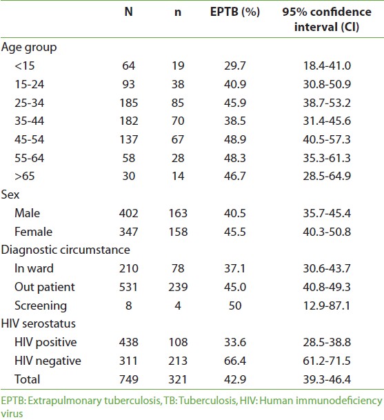 During the study period, a total of 749 patients were recorded for anti-TB treatment of whom 53.8% (402) were men. The overall prevalence of HIV in this population was 41.5% (95% CI38-45.1) and was similar in both sexes: OR 1.2 (95%CI0.7-1.9, P > 0.05). Of the total population, 42.9% (321) were diagnosed with EPTB [Table 1]. Their mean age was 37.8±15.6 years.
