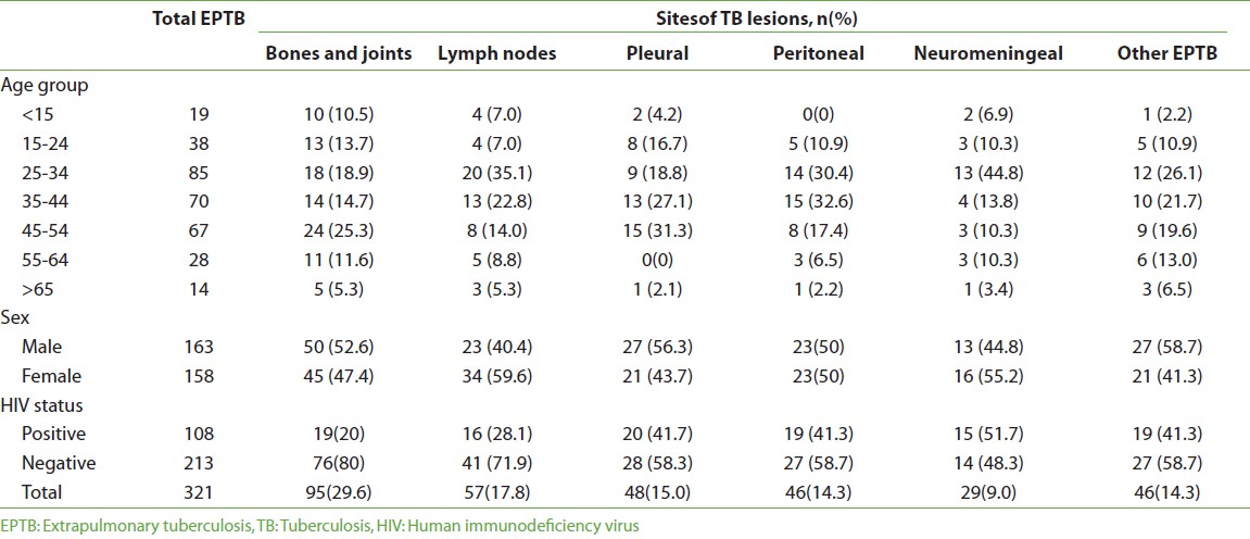 During the study period, a total of 749 patients were recorded for anti-TB treatment of whom 53.8% (402) were men. The overall prevalence of HIV in this population was 41.5% (95% CI38-45.1) and was similar in both sexes: OR 1.2 (95%CI0.7-1.9, P > 0.05). Of the total population, 42.9% (321) were diagnosed with EPTB [Table 1]. Their mean age was 37.8±15.6 years.