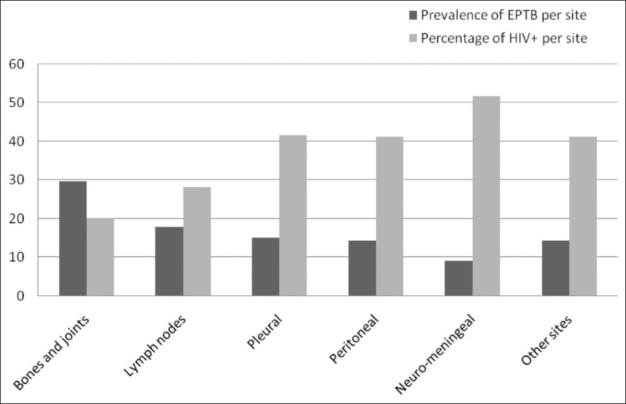 Context: Human immunodeficiency virus (HIV) infection and resulting immune depression are associated with increase proportions of extrapulmonary tuberculosis (EPTB). The prevalence of EPTB varies across studies between 15 and 50% and depends on the region, ethnic group studied, and HIV coinfection rates. In Cameroon, no studies have been done so far to evaluate the magnitude of this form of tuberculosis (TB), the various sites involved, and their association with HIV infection. Aims: To determine the prevalence of EPTB, the various organ sites affected and their association with HIV infection in a population of patients treated for TB. Settings and Design: We did cross-sectional analysis of the data from the TB register of the Douala General Hospital, a tertiary health institution situated in Douala, Cameroon. All cases of TB diagnosed between 1 st July 2007 and 30 th June 2011 were included. Results: Of total of 749 patients recorded for anti-TB treatment, the overall prevalence of HIV was 41.5% (95% confidence interval [CI]38-45.1). The prevalence of EPTB was 42.9% (321). HIV infection was present in 33.6% of patients with EPTB. The most affected sites of disease were bones and joints (29.6%), lymph nodes (17.8%), the pleura (15%), peritoneum (14.3%), and the central nervous system and meninges (9%). Neuromeningeal TB however, less common was most strongly associated with HIV infection, odd ratio (OR)2.3 (95% CI 1.1-5.0, p < 0.05). Conclusions: The proportion of EPTB among TB patients treated in the Douala General Hospital is relatively high with bone and joints being the most affected sites. HIV infection is most strongly associated with neuromeningeal forms. Keywords: Bone and joints tuberculosis, extrapulmonary tuberculosis, human immunodeficiency virus coinfection, neuromeningeal tuberculosis
