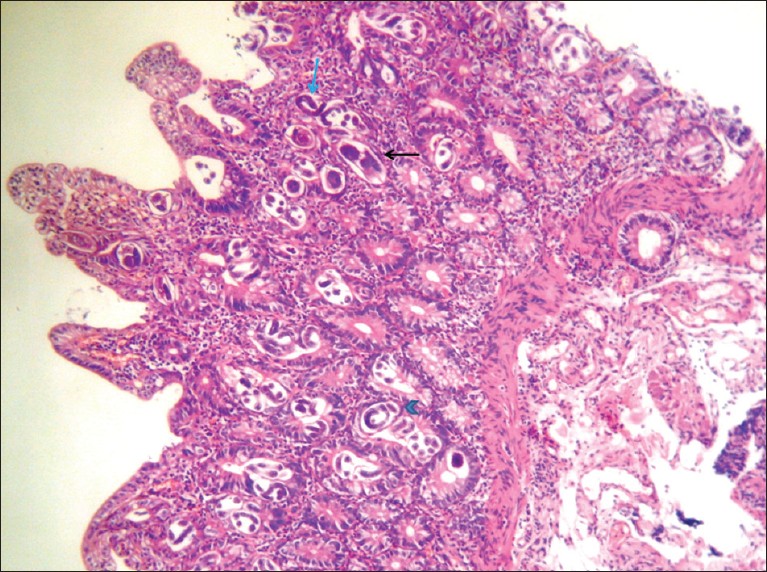 Figure 1: Photomicrograph of duodenal mucosa – eggs (black arrow), larval (blue arrow head) and adult forms (blue arrow) of Strongyloides stercoralis within the crypts and surface epithelium (H and E, ×100) |