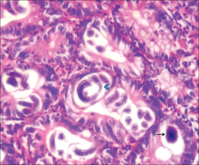 Figure 2: Photomicrograph of duodenal mucosa – eggs (black arrow) and larval form (blue arrow head) of Strongyloides stercoralis within the glands (H and E, ×400) |