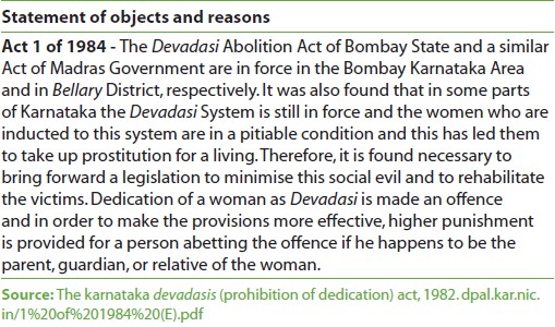 | How to cite this article: Sathyanarayana T N, Babu GR. Targeted sexual exploitation of children and women in India: Policy perspectives on Devadasi system. Ann Trop Med Public Health 2012;5:157-62 |