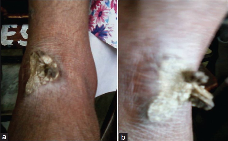 A 42-year-old man presented with painless horny hyperkeratotic lesion over the dorsum of the left foot for 9 years duration. He gave a history of trauma at that site in his agricultural field in the rainy season. He has taken multiple courses of antibiotics from the local doctor. He was a non-smoker but used to take alcohol on a daily basis. He also had a history of pulmonary tuberculosis 15 year back, which had been cured after taking medicatin for 10 months.